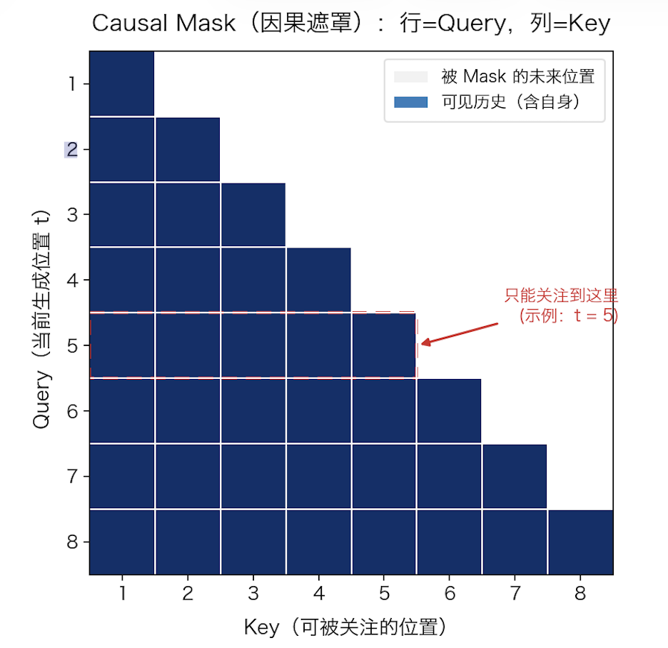 在语言建模或生成式任务(如翻译解码、对话生成)中,模型在预测当前词时不应该看到未来的词,否则就破坏了因果性。为此,Self-Attention 中通常引入 Causal Mask(因果遮罩):
