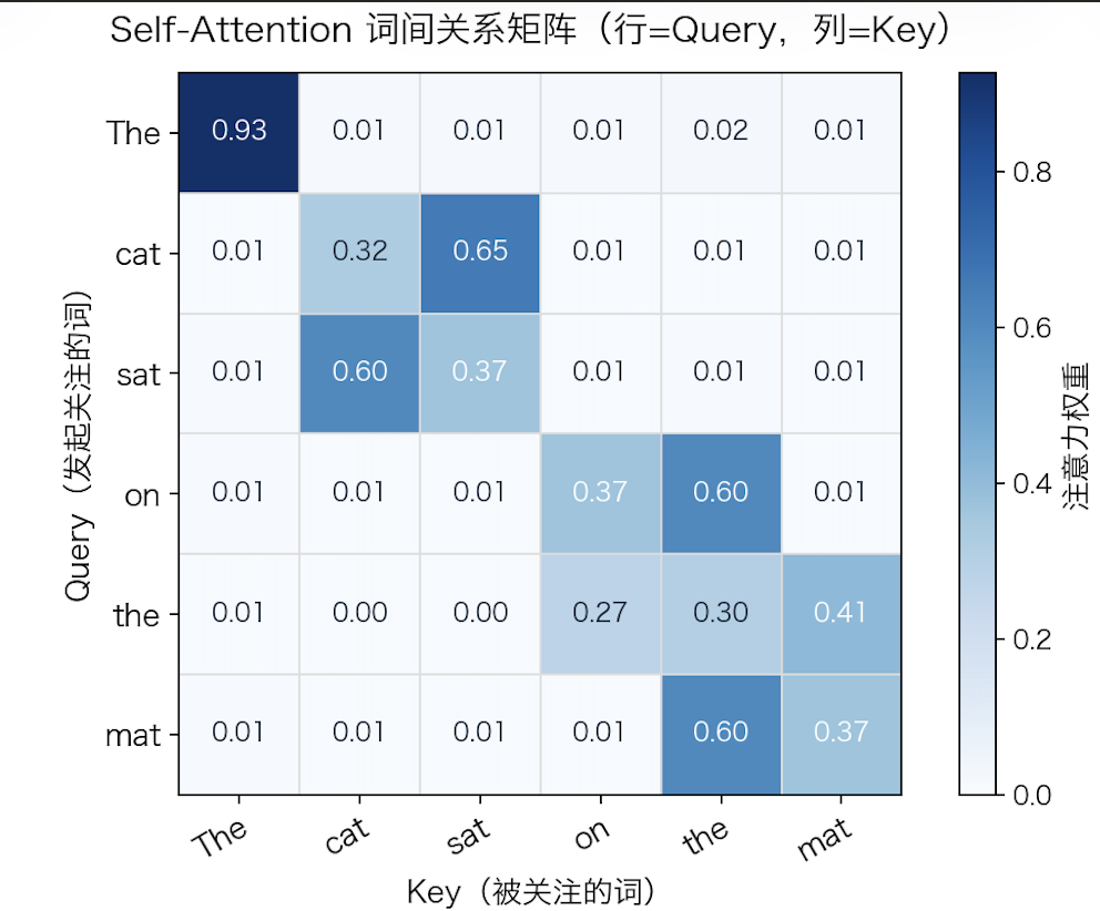核心思想是每个词不再只依赖局部上下文,而是通过注意力分布,与序列中所有其他词建立联系。