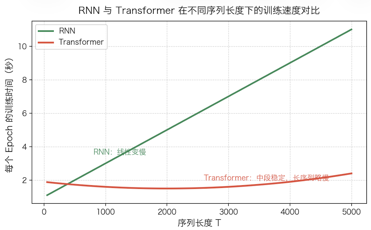 该图对比了 RNN 与 Transformer 在不同序列长度下的训练效率变化趋势。可以观察到: