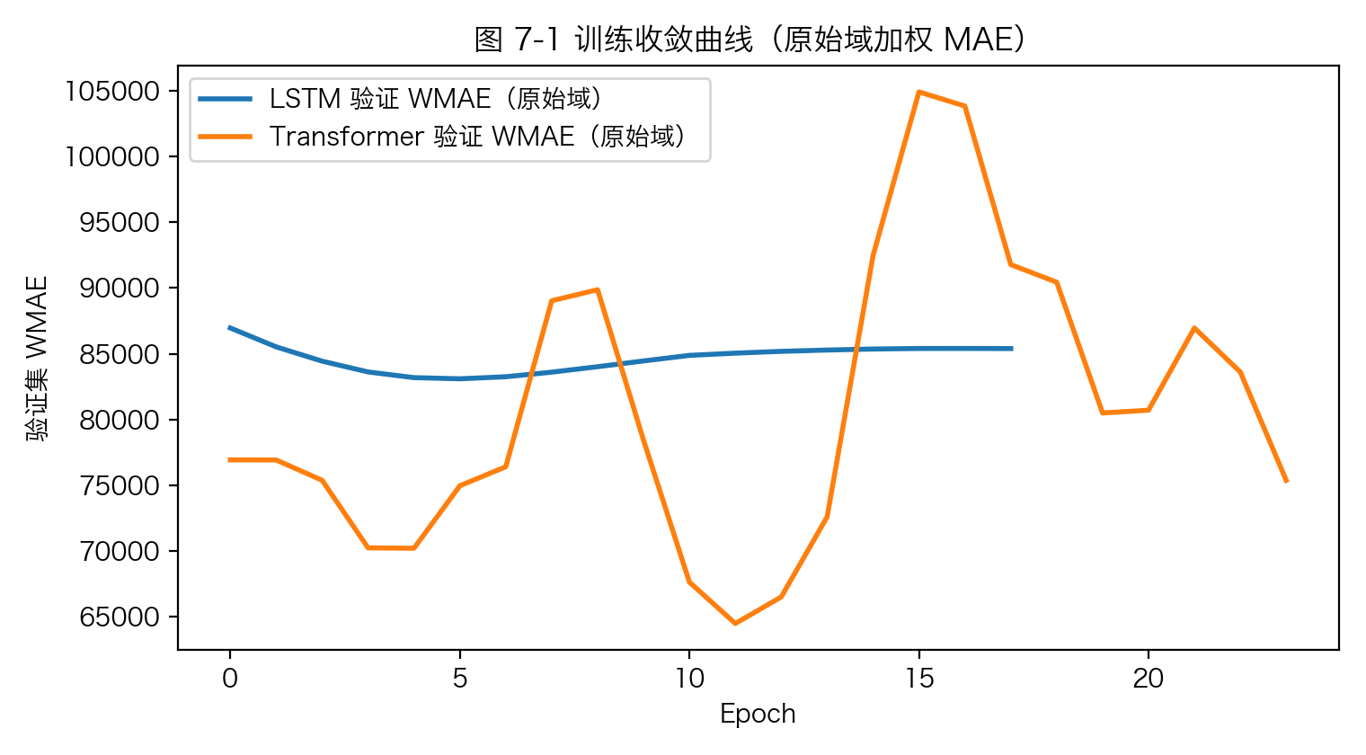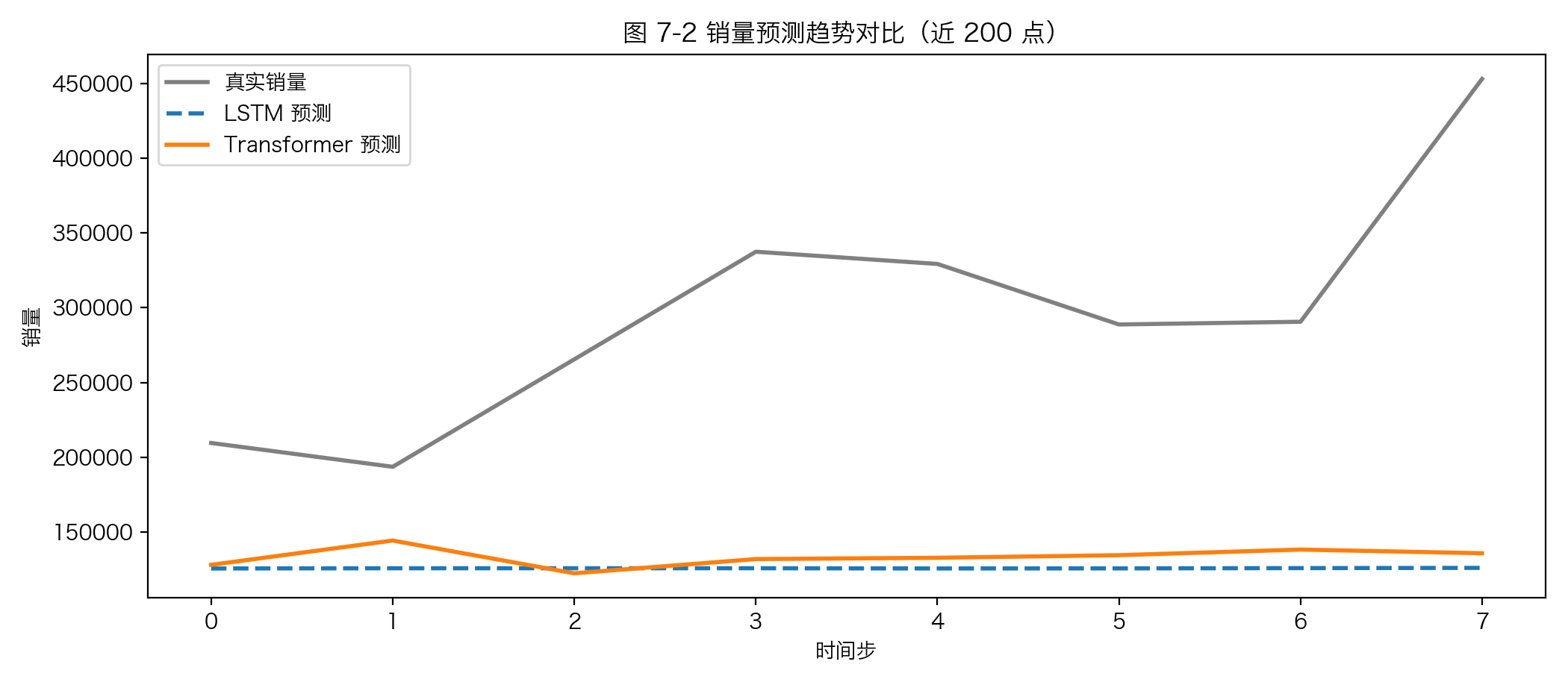 在当前设置下,Transformer 在四项指标上都略优于 LSTM,数值差距大致在 4–6% 左右。考虑到样本量有限、且时间粒度为周频,这些结果更适合被理解为一种趋势性观察,而不是严格的统计结论。结合图 7-1/7-2/7-3 可以看到:Transformer 在捕捉整体趋势与节奏性波动时略显平滑,对较大的销量起伏有一定缓冲;而 LSTM 在局部短期段落上的拟合能力依然具有竞争力。