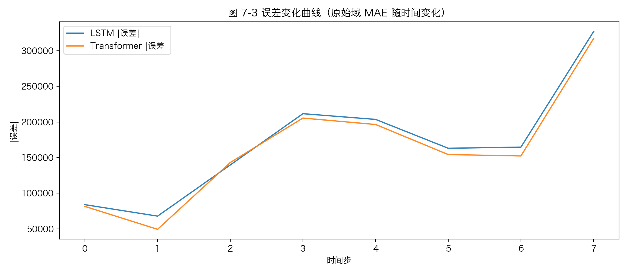 Transformer 在捕捉中长期趋势与复杂季节性时略有优势,而 LSTM 在短期平稳段仍具竞争力。
