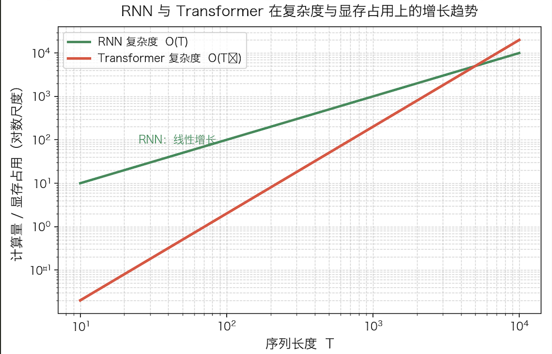 该图直观反映了两类结构在 计算复杂度层面 的本质区别:RNN 计算受时间依赖限制但资源消耗较低,而 Transformer 虽能全局并行建模,但在长序列处理上代价更高。
