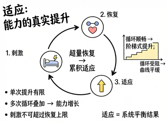在明确“努力方向偏差”这一问题之后,有必要进一步分析成长的内部结构。能力提升并非发生在训练当下,而是在训练之后的生理重建过程中完成。要系统理解这一过程,需要建立一个清晰的逻辑框架,将训练刺激、恢复过程与最终适应联系起来。