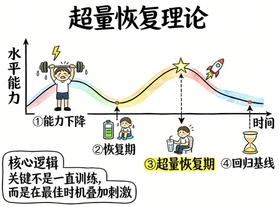 第三阶段,超量恢复期。在恢复完成后,能力短暂超过原有基线,形成一个“最佳再刺激窗口”。