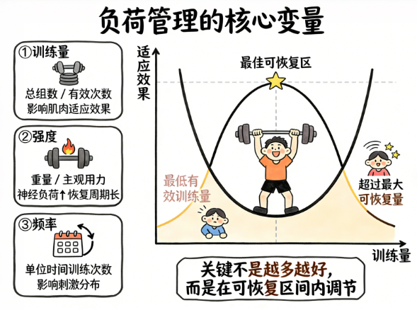 这三个变量共同决定刺激规模。然而刺激规模必须与恢复能力相匹配。理论上存在一个“最大可恢复训练量”的范围,当训练量接近但未超过这一范围时,适应效果最佳;若明显超过,则疲劳累积加速。