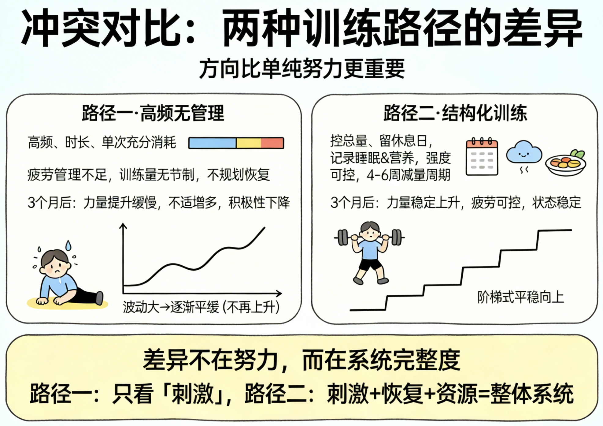 路径一,追求高频与高时长,强调单次训练的“充分消耗”。短期内主观满足感较强,但疲劳管理不足,训练量无节制增长,恢复资源未被纳入规划。三个月后,力量提升缓慢,偶发不适增加,训练积极性下降。