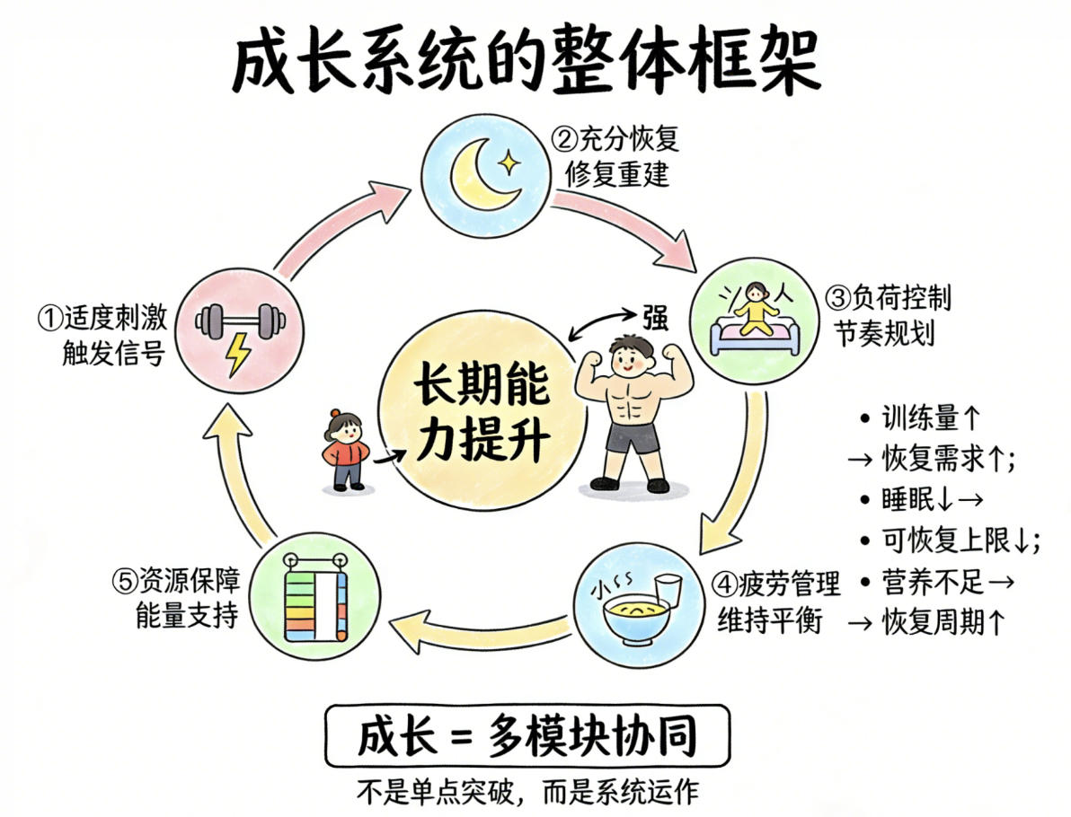 因此,成长系统可理解为一个动态闭环结构:刺激触发适应信号,恢复完成修复,资源供给支持重建,周期规划控制节奏,疲劳管理维持平衡。